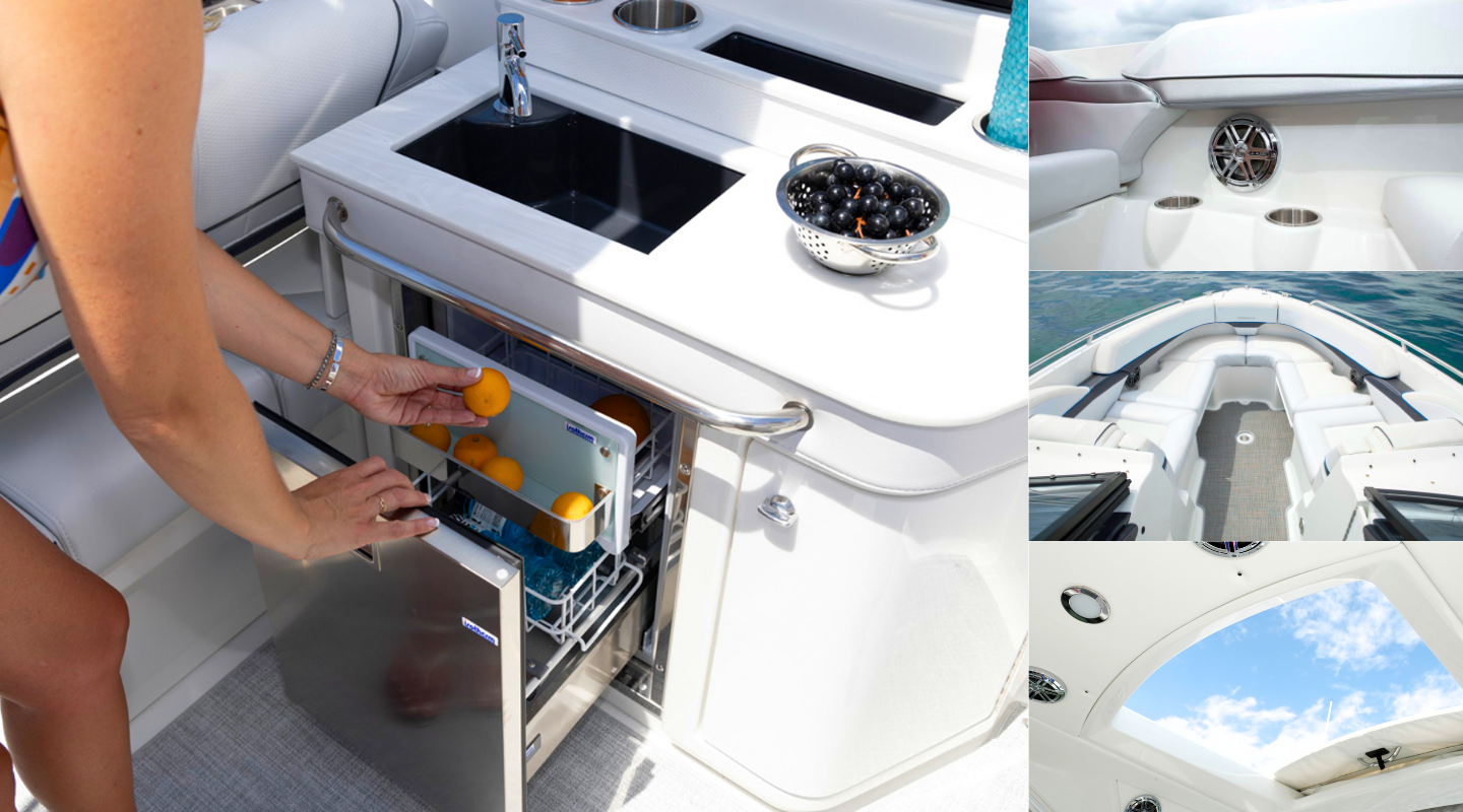 Polished stainless steel drink holders are placed exactly where you need them, and a solid single latch head door adds a reassuring sense of quality. Generous, well organized storage, including dedicated spaces for tables, filler cushions, and fenders, keeps every outing refined, comfortable, and beautifully streamlined.