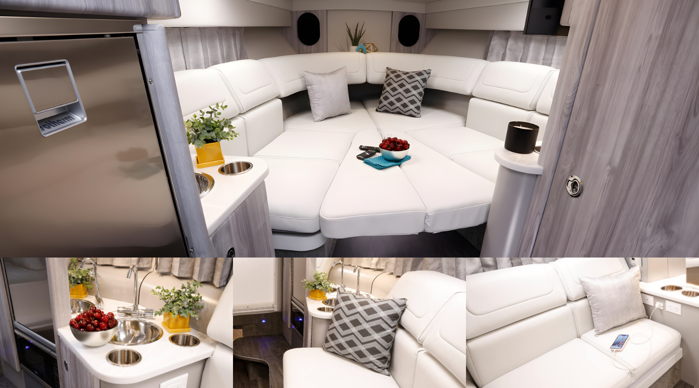 An integrated wetbar with a genuine Corian countertop, large sink, and optional cooler or refrigerator makes entertaining effortless, while smooth fiberglass storage compartments open gracefully on gas springs or specialized hinges.