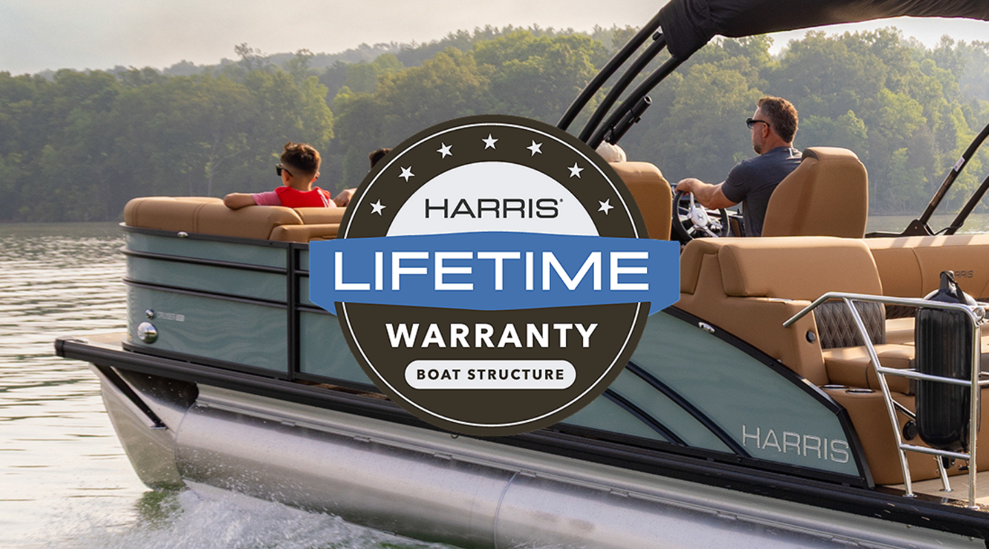 Lifetime Structural WarrantyAs a Harris owner, you receive a Limited Lifetime Warranty on your entire structure, including pontoon tubes, crossmembers, decking, motor mount and fence rail. Harris is proud to stand behind their boats with superior customer service & dealer support.