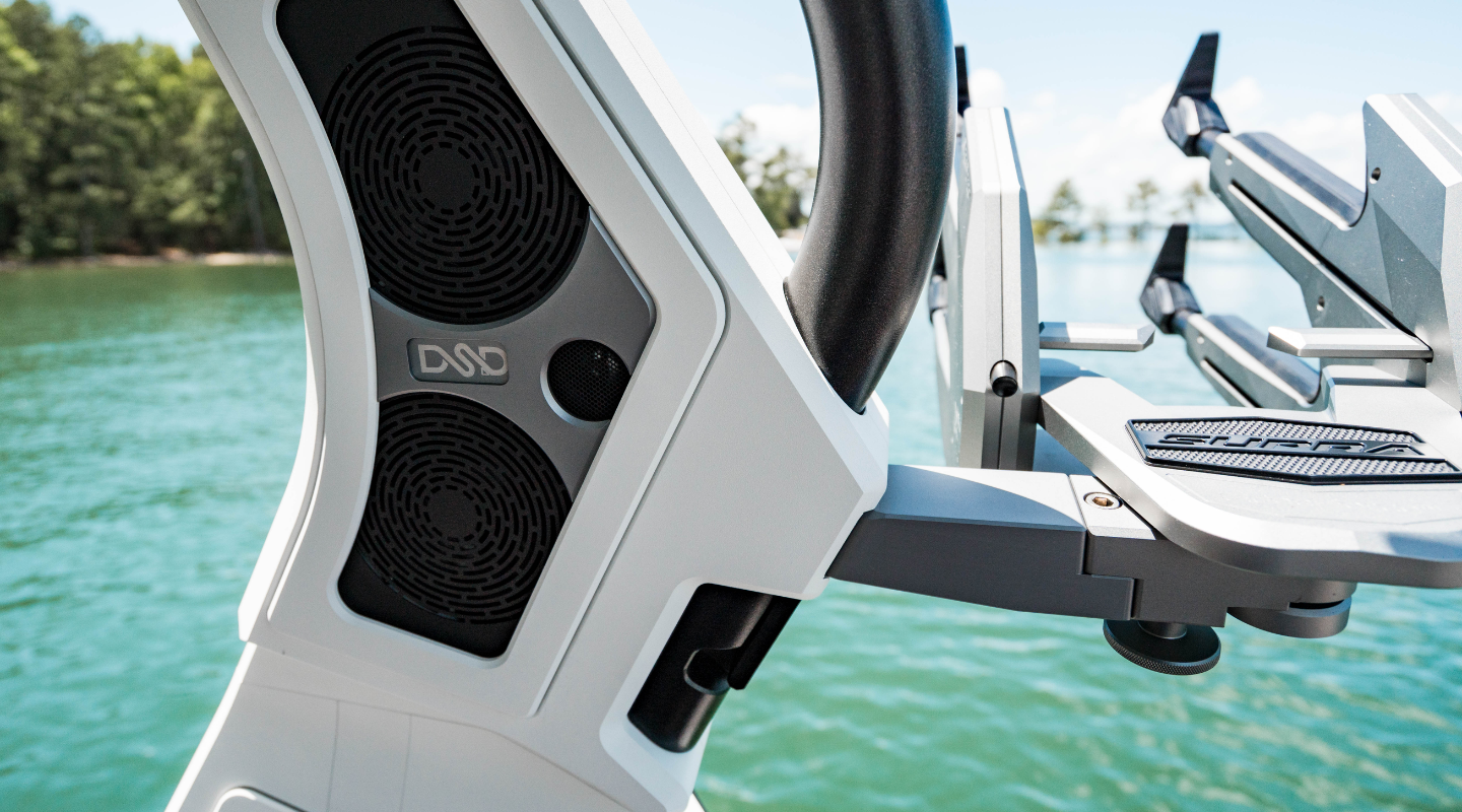 Dynamic Sound Design (DSD) is an on-board audio experience, not just a volume level. Supra seamlessly pairs active DSD technology with carefully selected components integrated throughout the boat, delivering the perfect blend of power and finesse to your music. You will hear the finest details, enhancing musical quality.